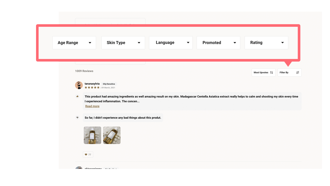 Customers can search in multiple languages and find product reviews from people who have a similar skin type and age.