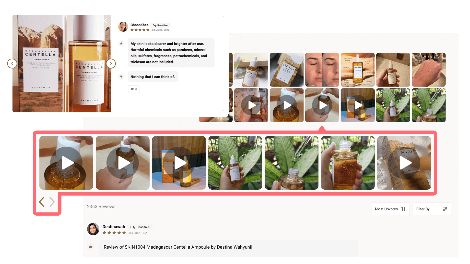 Highlight your best video reviews! High quality UGC video reviews will give your customers trustworthy information on the product’s look and texture. Seeing personal video testimonials from other skincare lovers provides a meaningful, closer look at the product that consumers can trust!